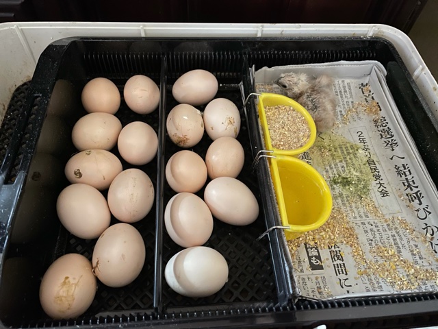 ということで、孵卵器にはタマゴ17個と23日生まれのヒヨコ1羽です。
