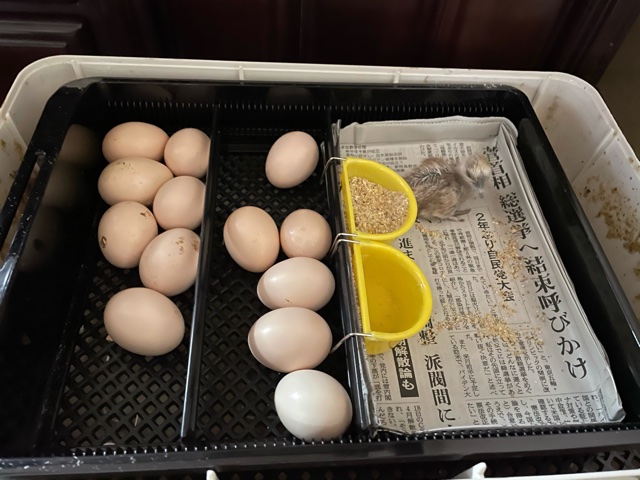 残りのタマゴは我が家の孵卵器に13個、農場の2階建てに4個の合計17個です。