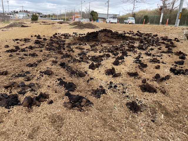 10山ある鶏糞堆肥の内1つを、崩して崩して撒いて撒いて